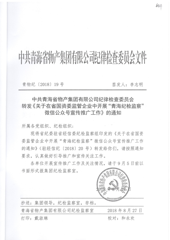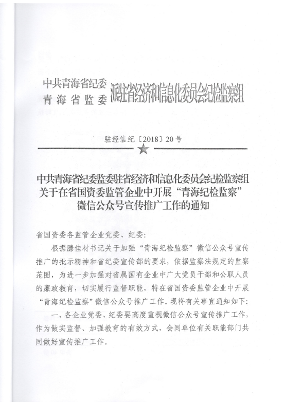 轉(zhuǎn)發(fā)《關(guān)于在省國資委監(jiān)管企業(yè)中開展“青海紀檢監(jiān)察”微信公眾號宣傳推廣工作》的通知
