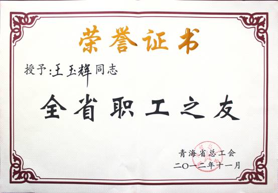 在2012年11月23日召開的青海省工會第13次代表大會上,省總工會對全省優(yōu)秀個人、模范集體進行了表彰。集團總經(jīng)理王玉輝同志榮獲"全省職工之友"榮譽稱號;青海物產(chǎn)物資配送有限責任公司工會榮獲"全省模范職工之家"榮譽稱號;馬軍同志榮獲"全省優(yōu)秀工會積極分子"榮譽稱號;丁勇同志榮獲"全省優(yōu)秀工會工作者"榮譽稱號。