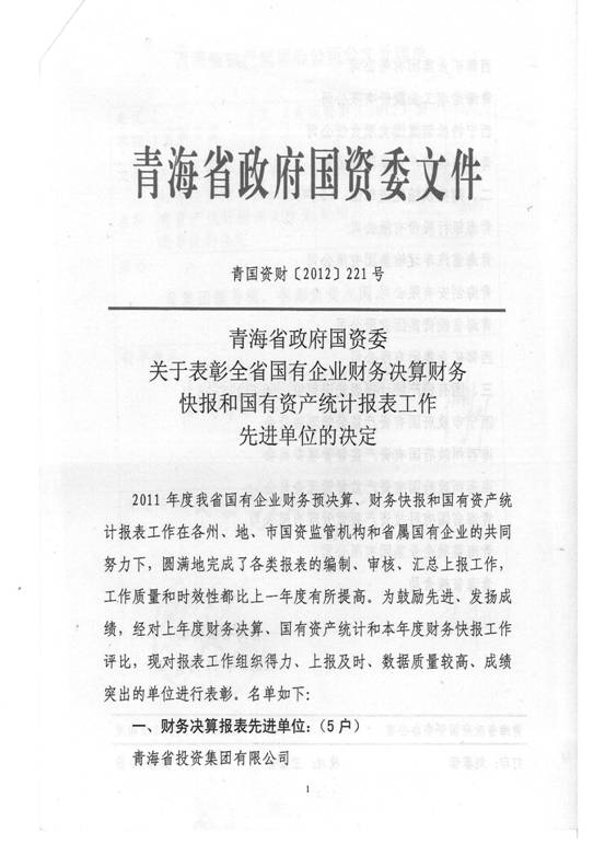 2012年,在集團(tuán)及所屬各公司領(lǐng)導(dǎo)的高度重視下,在所屬各公司的大力支持和密切配合下,在辛勤工作在財(cái)務(wù)會(huì)計(jì)崗位上的同事們的共同努力下,集團(tuán)總公司圓滿(mǎn)完成了省國(guó)資委和省財(cái)政廳各類(lèi)報(bào)表的上報(bào)工作,財(cái)務(wù)信息工作質(zhì)量、時(shí)效性和財(cái)務(wù)分析水平都比上一年度有所提高,受到了省國(guó)資委和省財(cái)政廳的好評(píng),集團(tuán)總公司2011年度財(cái)務(wù)決算工作被省國(guó)資委評(píng)為先進(jìn)單位,集團(tuán)財(cái)務(wù)審計(jì)部張莉青同志被省財(cái)政廳評(píng)為2012年度財(cái)務(wù)快報(bào)工作先進(jìn)個(gè)人。